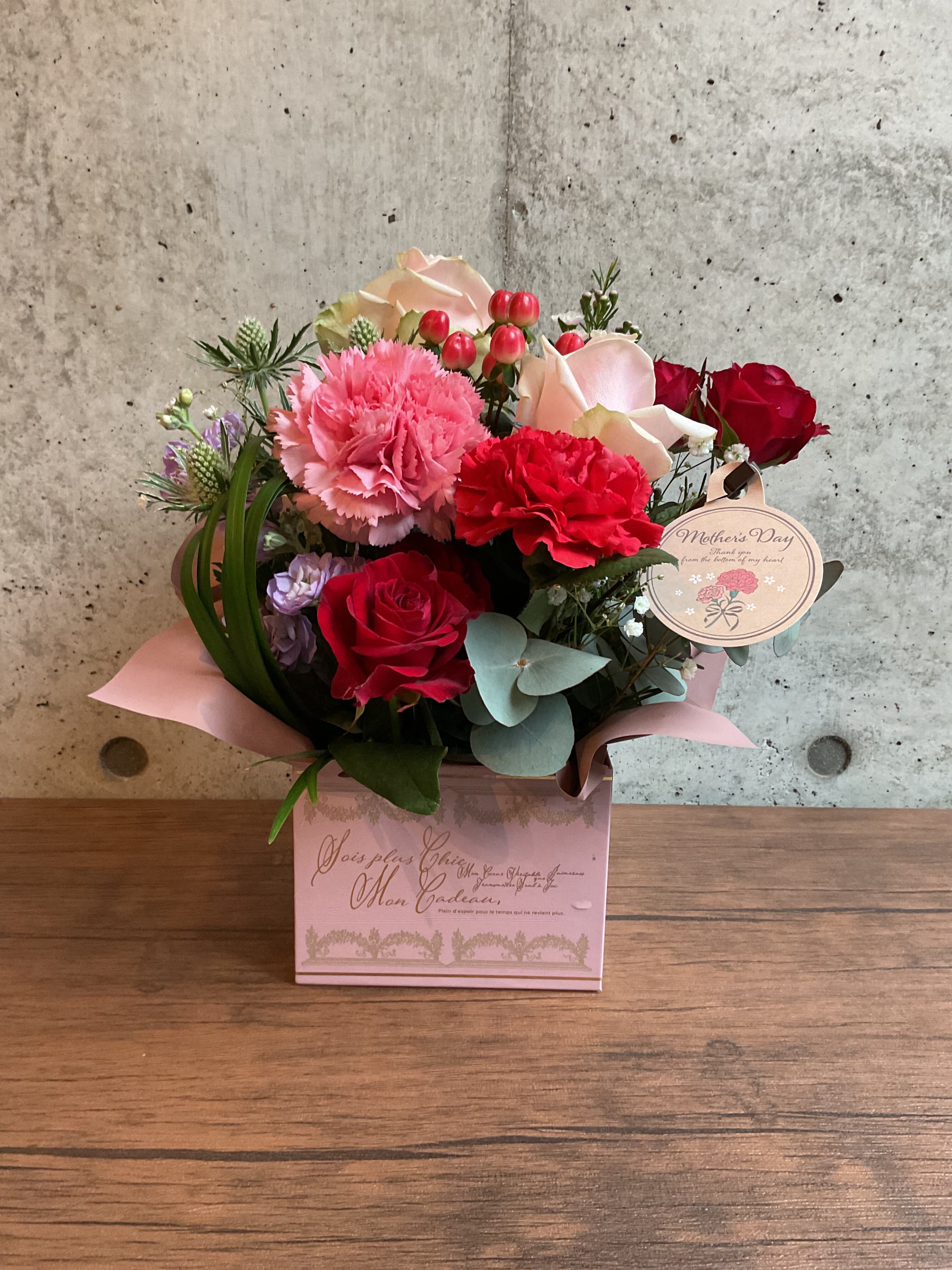 カーネーションや季節のお花を使って作るアトリエレーヴのアレンジメント。