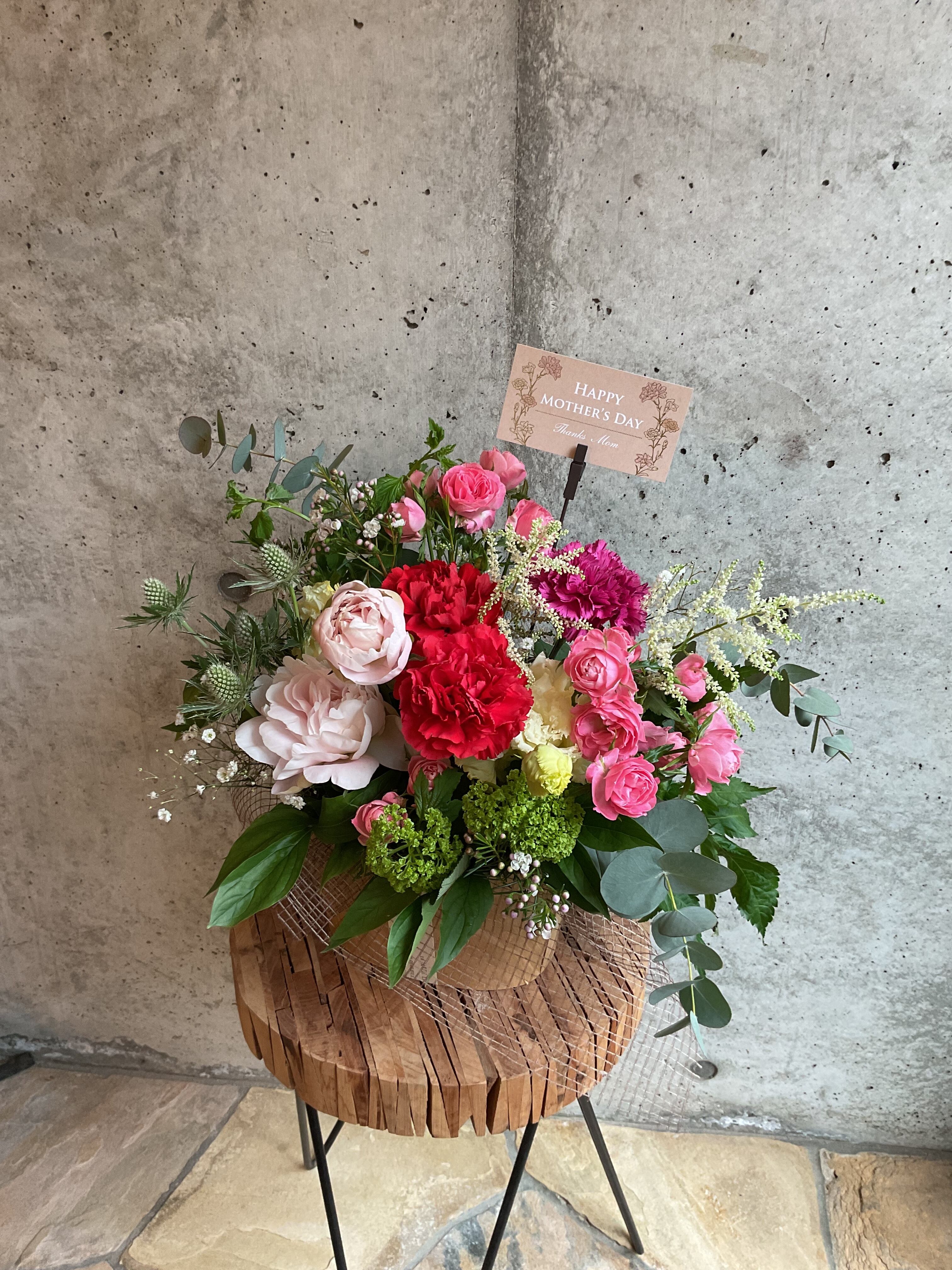 カーネーションはもちろん、季節のお花をたっぷり使用したアレンジメントです。もらったら嬉しいこと間違いなし。