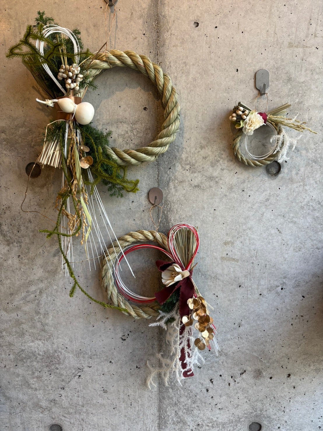 縦に藁をしめたタイプのしめ縄に造花をあしらいました。